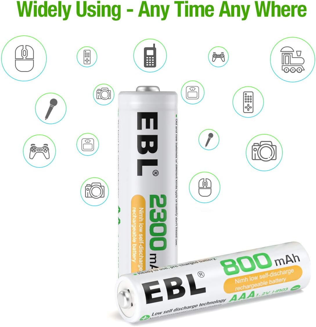 Features: *EBL batteries devote to low self-discharge technology, holds 80% power after 3 years while general rechargeable batteries will lose all the power if not using for a long time. *The batteries don’t contain Hg/Cd/Pb, no pollution to the environment. *The batteries made with superlattice alloy, high retention rate of electric charge, low loss of capacity, excellent discharge performance at high temperature, can be recharged deeply, super long life. *The batteries are 0.1V higher than others when full charged, more suitable for long time use. Package included: 8x 2300mAh AA rechargeable Ni-MH batteries 8x 800mAh AAA rechargeable Ni-MH batteries About EBL EBL is a certified brand manufacture that produce EBL series general use batteries such as AA/AAA/9V/C/D rechargeable battery, many kinds of battery charger for different types battery.